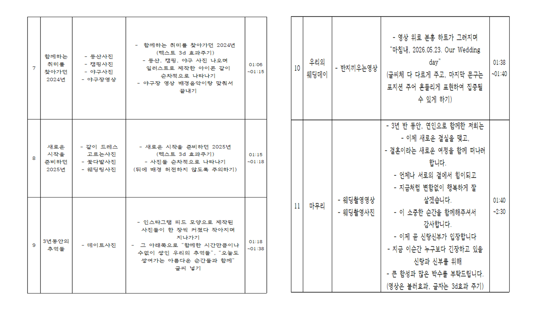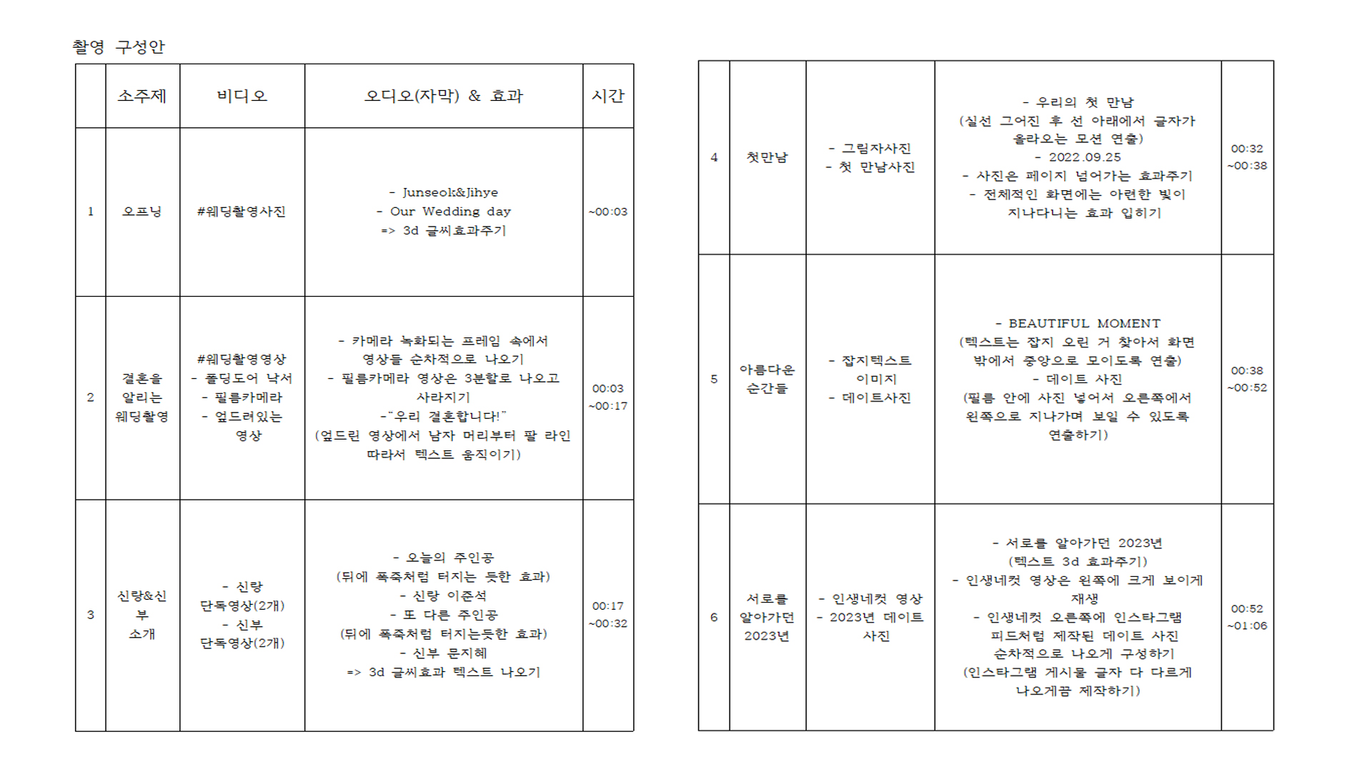 결혼식에 초대될 하객들에게 신랑신부의 연애스토리와 앞으로의 마음가짐, 하객들의 축하를 위한 영상을 제작해보았어요!