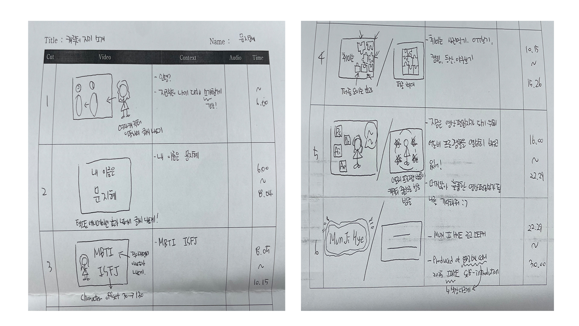 나를 30초 내에 어떤 식으로 표현해야 좋을지에 대해 구성하는 부분이 가장 어려웠고, 그 후에는 생각한 것을 캐릭터와 효과들로 표현해내는 것에 대한 문제들이 있었다.